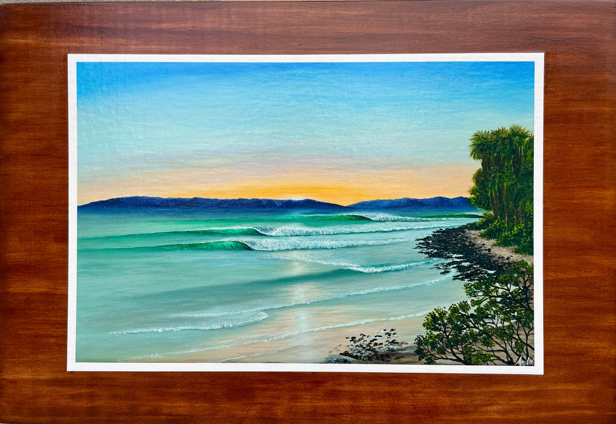 Epic Rincon at Sundown. 12 x 16". Giclee print mounted on a Koa-like painted solid wooden plank. These are absolutely gorgeous and come ready to hang. Each product is individually made by me. Each piece is one-of-a-kind.