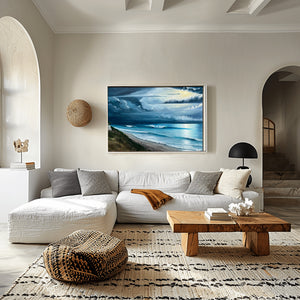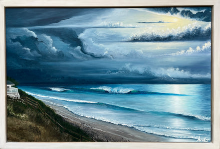 Lunar Glow Over Beacons. 16" x 24". Acrylic on a thin wood panel. Price includes a custom hardwood float frame. This piece provides a cosmic late night lunar glow to some peeling waves over the reefs at Beacons. Try and surf under the glow of a full moon. It's completely different from a daytime surf.