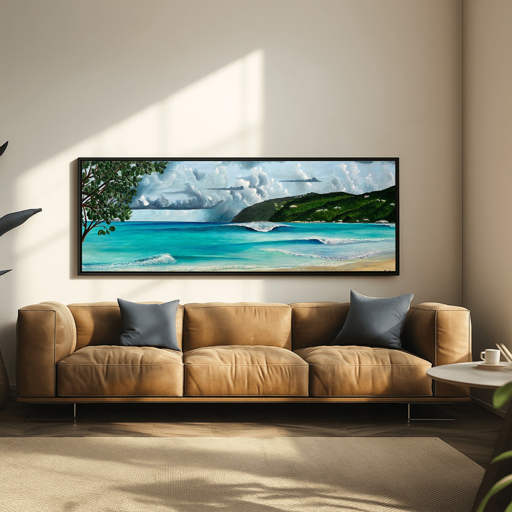 Bomba Shack Reef - 18" x 48". Acrylic on a thin wood panel. This piece is a representation of a place in the Caribbean that is magical. The combination of the water's colors, the lush environment, and the culture of the islands makes this place a premier surf location. This piece will dominate any room with its size and vivid colors.